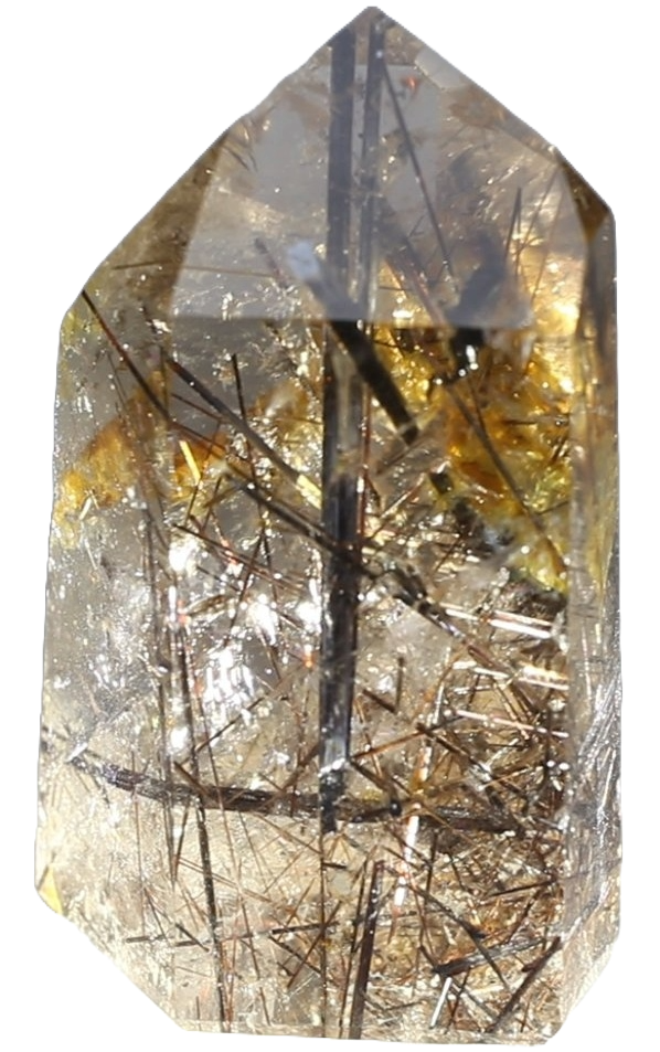 Klar til røgfarvet kvarts med indre tråde (“nåle”) af: Sølv/hvid, Guld, Rød/orange, Sort