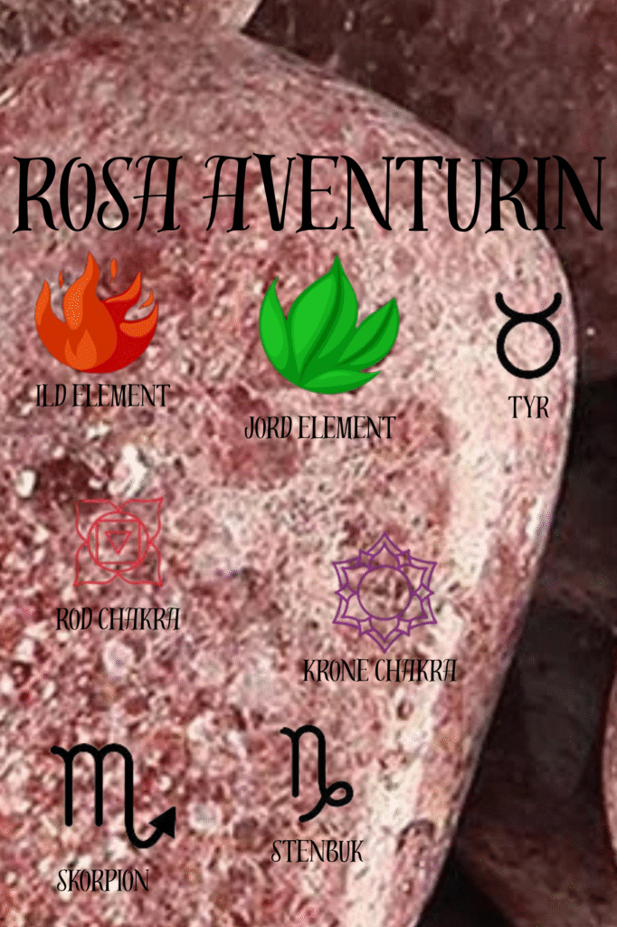 Rosa aventurin har en mild og kærlig energi og kan hjælpe dig med at få et positivt livssyn. Den bruges mod forskellige former for gift, og den kan bruges til at neutralisere andre energier, både positive og neagtive. Den åbner for kontakten til sjæleenergi på en naturlig måde som i de fleste tilfælde vil give super godt humør.