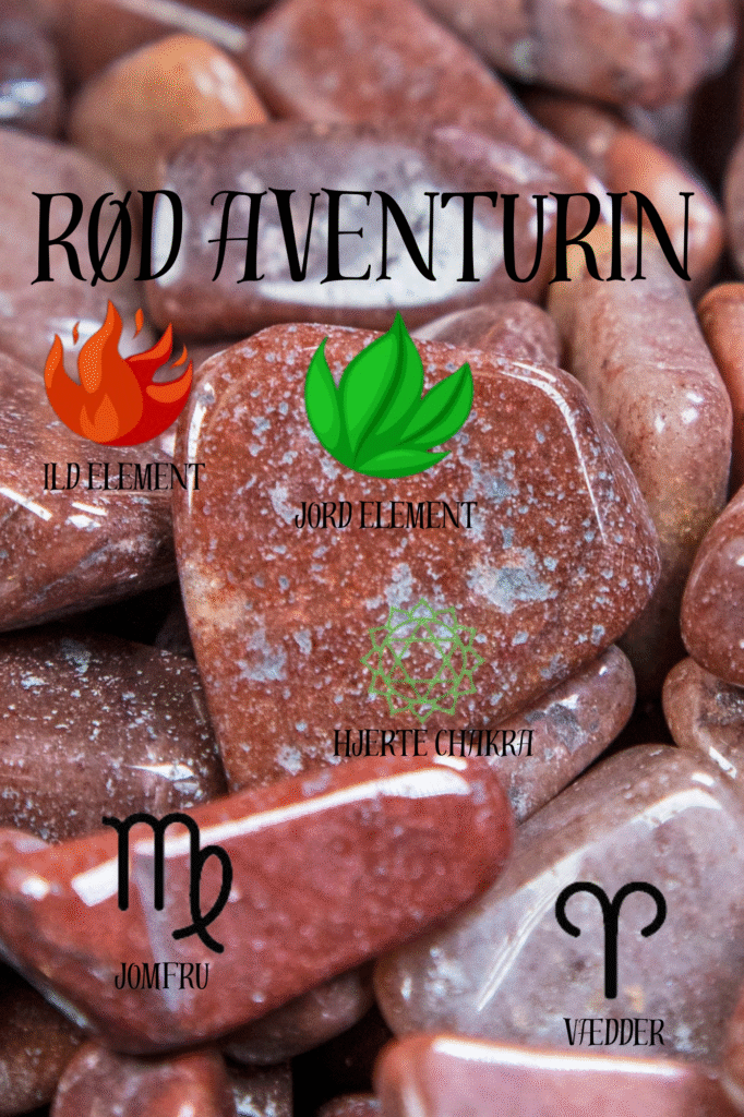 Selvtillid. Giver som grøn aventurin held i pengesager, og har stor indflydelse på vores økonomi. Arbejder med det fysiske. I de sten hvor indeslutningerne kan ses og genkendes, kan de egenskaber som disse indeslutninger har, også anvendes. Bruges sammen med lysegrøn aventurin til at skabe en overflod af penge. Anvendes mod kvalme, stress og alment ubehag. Den bringer held og held til bæreren. Rød aventurin kan bruges til at fremme fysisk og følelsesmæssig healing, samt til at øge selvtillid og selvværd. Rør aventurin er kendt for at hjælpe med at fremme følelser af tillid og sikkerhed. Den er særlig nyttig for dem, der har brug for at stå op for sig selv og deres tro. Rød aventurin hjælper med at fjerne blokeringer i rodchakraet, som er forbundet med vores følelse af sikkerhed og tilhørsforhold. Den hjælper os til at føle os forankret i vores miljø og forbundet med dem omkring os. Rød aventurin er en kraftfuld helbredende sten, da den hjælper med at balancere følelser og hjælpe med at helbrede fysiske lidelser. Den hjælper med at fremme følelser af glæde og vitalitet. Rød aventurin er en kraftfuld sten, der kan være med til at skabe følelser af mod, sikkerhed og glæde