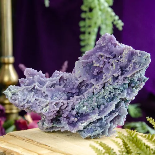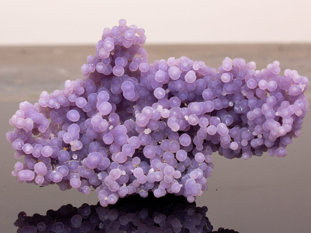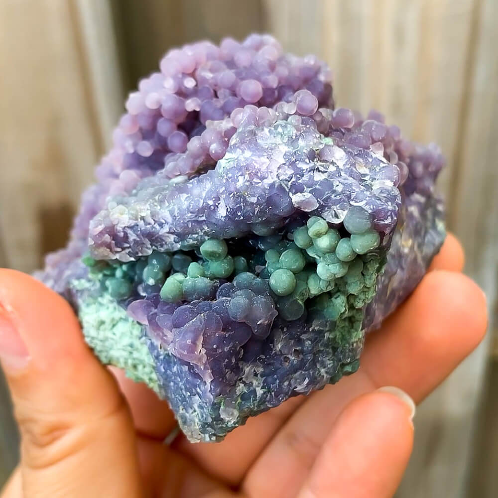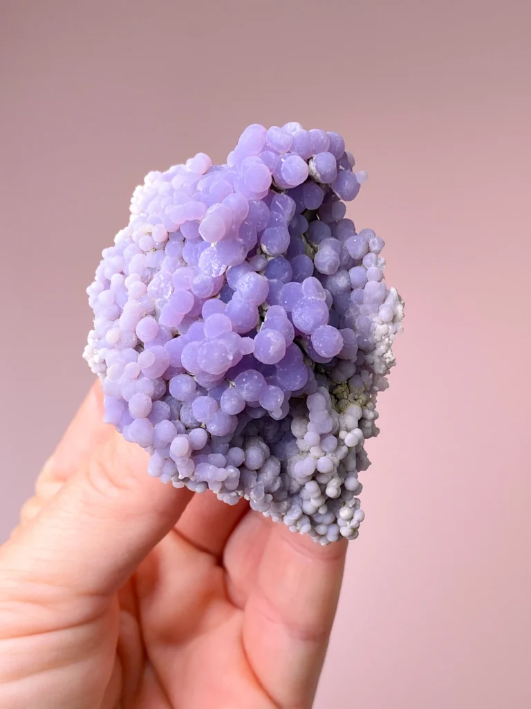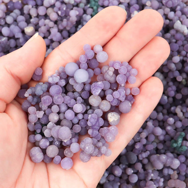 Drue agat er en nyligt opdaget lilla sten fra Indonesien. Den består af små kugleformede krystaller, der er formet sammen for at ligne en klase vindruer. Men i stedet for bånd består den af små runde krystaller, der er dannet sammen over tid. Dette kaldes en botryoidal formation. Ordet Botryoidal oversættes bogstaveligt til “klynge af druer.” Grape Agat består af kvarts og morganit.
