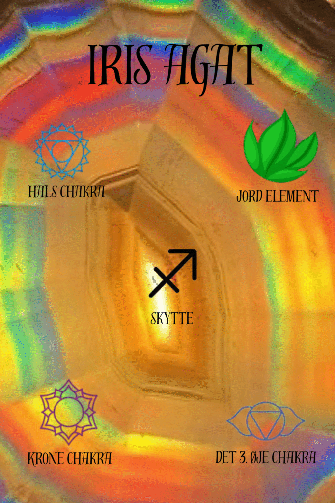 Den er forbundet med håb, balance og positiv energi. Den siges at være hjælpsom i at overvinde udfordringer, hvilket gør den til en sten fyldt med optimisme. Iris agat er en transformativ krystal, der kan hjælpe dig med at reflektere over dig selv og i sidste ende give klarhed indeni. Energierne er ekstremt potente og kan gavne hele dit chakrasystem, men resonerer hovedsageligt med krone-, tredje øje- og halschakraerne. Der er vibrationer, der opererer på højere frekvenser, som Iris agat er i stand til at hjælpe med at overføre til din egen fysiske eksistens. Dette opnås hovedsageligt gennem dyb meditation, som engagerer kronchakraet og forbinder det med spirituelle energier hinsides dette plan. Det tredje øje er i stand til at modtage betydelige billeder gennem klar drøm, astral projektion og andre former for drømmearbejde. Disse ideer og energier bliver til sidst en vokal del af din virkelighed og kan snart blive en del af et nyfundet mål eller ønske, der motiverer og ophidser dig selv.