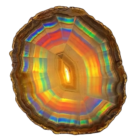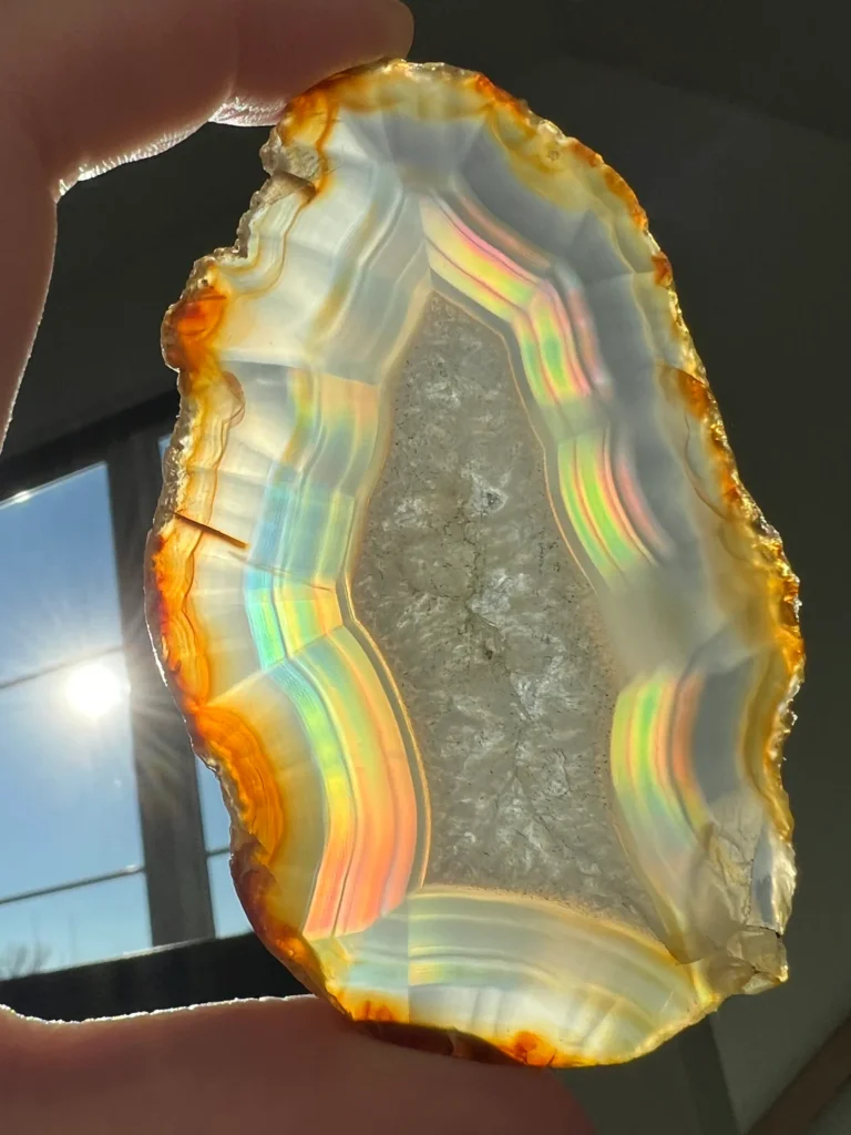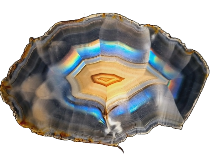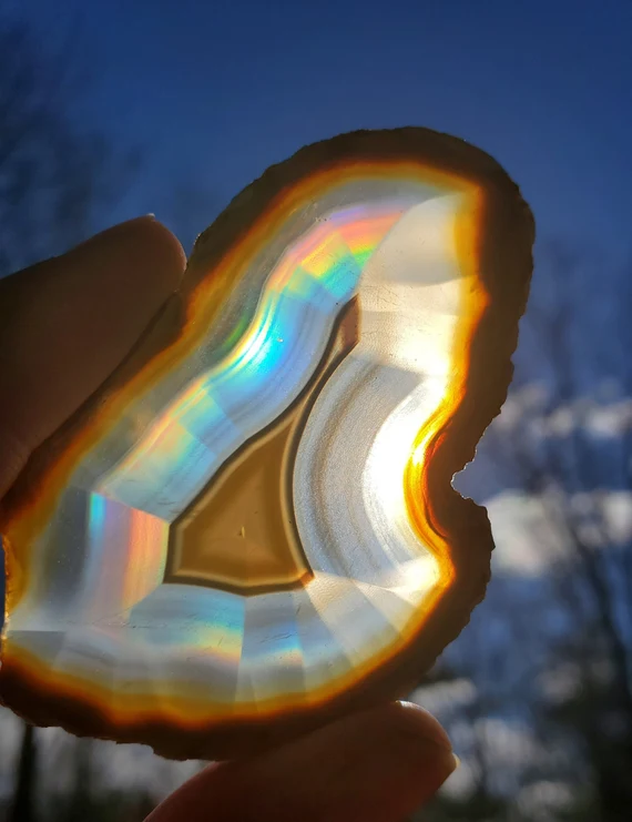 Iris agat er oftest en grå agat af udseende, men vises den i lyset kommer der en regnbue af farver, svarende til bagsiden af en CD