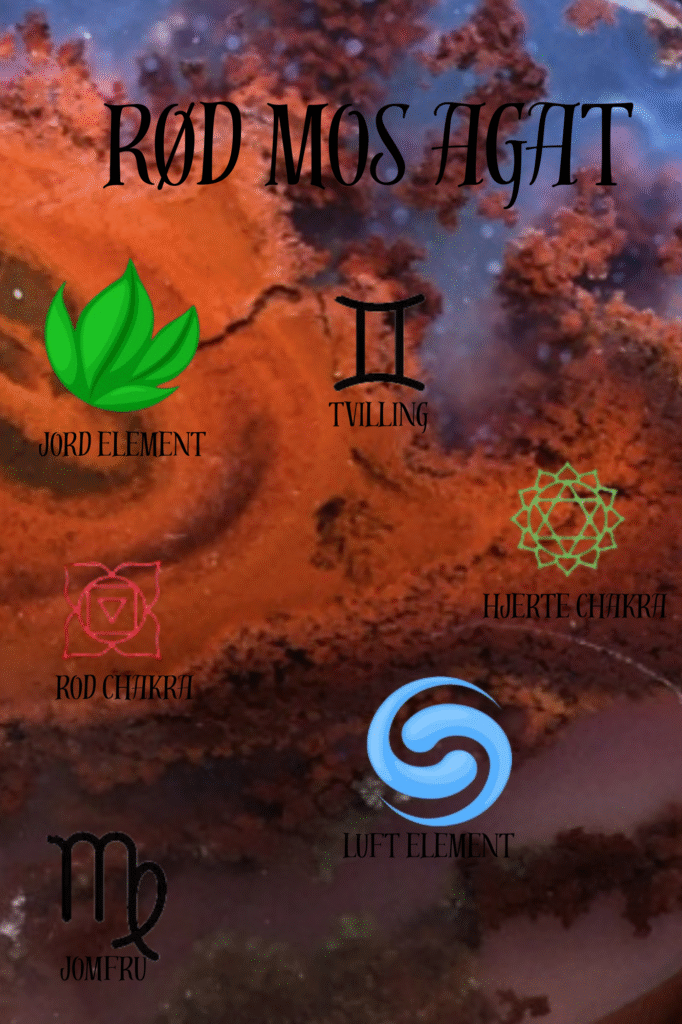 Rød mos agat er en sten, der hjælper dig med kommunikation, afklaring og åbner op for løsninger for at kunne mindske og opklare misforståelser mellem mennesker. Dette kan igen hjælpe dig med at se, hvilke mennesker du kan stole på og som vil dig det bedste her i livet. Denne sten spreder harmoniske og beroligende energier til både dig og dens omgivelser, og kan også helbrede sårede forhold og følelser. Rød mos agat øger din kreativitet og hjælper dig med at finde den gnist og energi, du skal bruge for at nå dine mål her i livet. Derudover er denne sten med til at bortfiltrere negativitet i dine omgivelser og styrker dig i stedet med den positive energi, der er omkring. Denne sten giver dig jordforbindelse, og virker på både sakral- og rodchakraet. Fysisk siges der at Rød mos agat beskytter mod vira og helbreder hudsygdomme. Den har en enorm styrke og forbindelse til jorden. Den arbejder langsomt, men sikkert, den skal nok nå det hele, når tiden er til det. Den kan hjælpe til at sikre dig ro og langsomhed. Den er god at arbejde med, hvis det hele går lidt for hurtigt, og du har brug for at finde tilbage til dig selv og din indre styrke. Den Røde mos agat giver dig ekstra grounding, så du kan stå stærkt i dig selv. Den er også gennem tiderne blevet brugt til at tiltrække rigdom og velstand. Den arbejder også godt i rigdom og overflod.