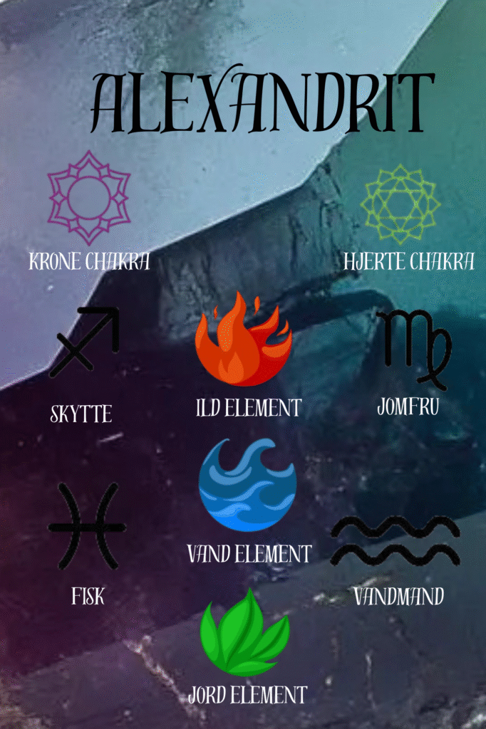 Balance, transformation, fornyelse, fremmer personlig vækst og tilpasningsevne. Alexandriten menes at besidde magiske egenskaber – sandsynligvis på grund af dens mystiske farveskiftende evne – og være et godt varsel eller talisman, fordi det styrker bærerens intuition for at hjælpe ham/hende med at finde en vej ud af en situation, hvor logikken svigter, og der dukker op. at være noget svar eller vej frem. Den er også kendt for at inspirere fantasien og hjælpe kreativiteten.
